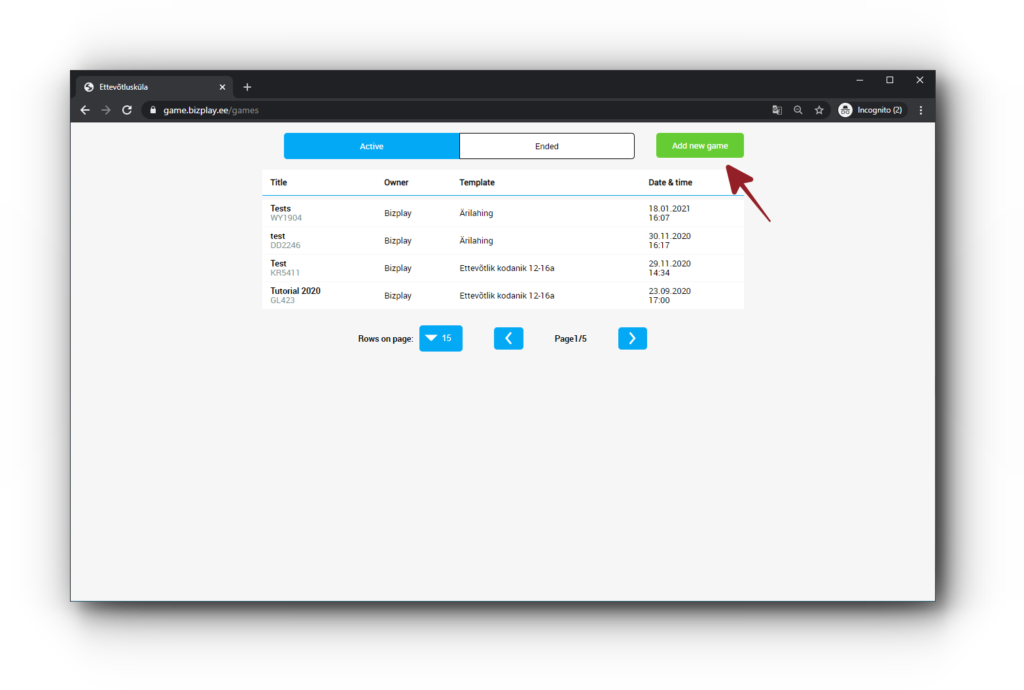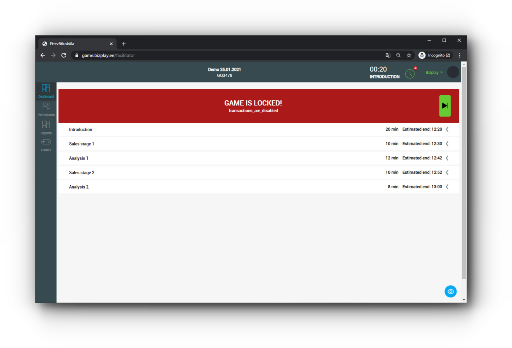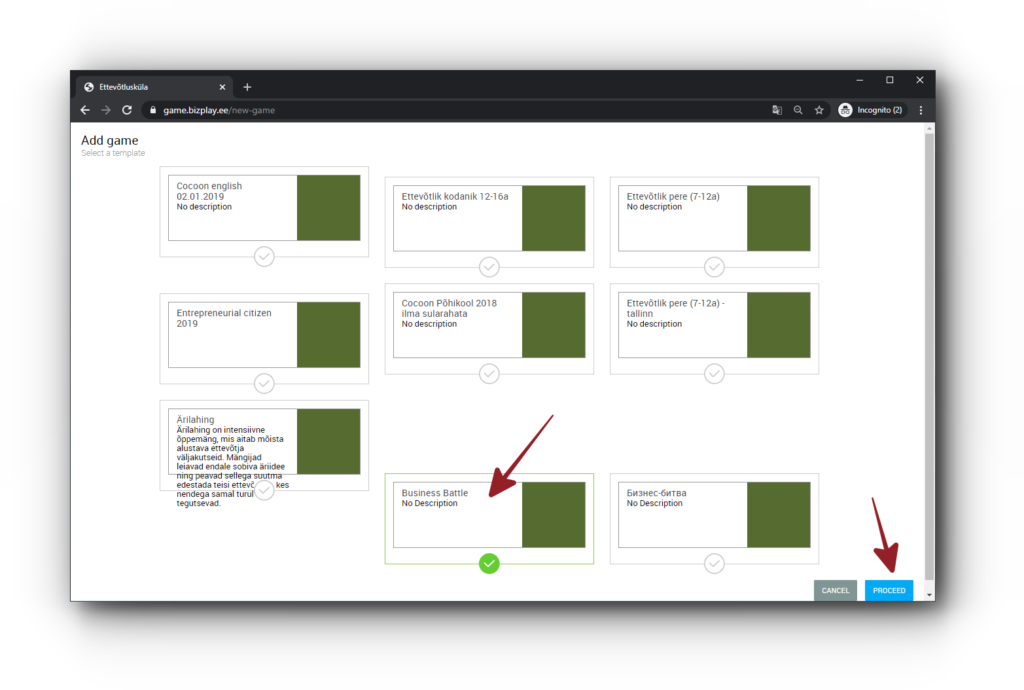 2. The available game templates are then displayed. Select the ‘Business Battle’ template and then press ‘Proceed’.