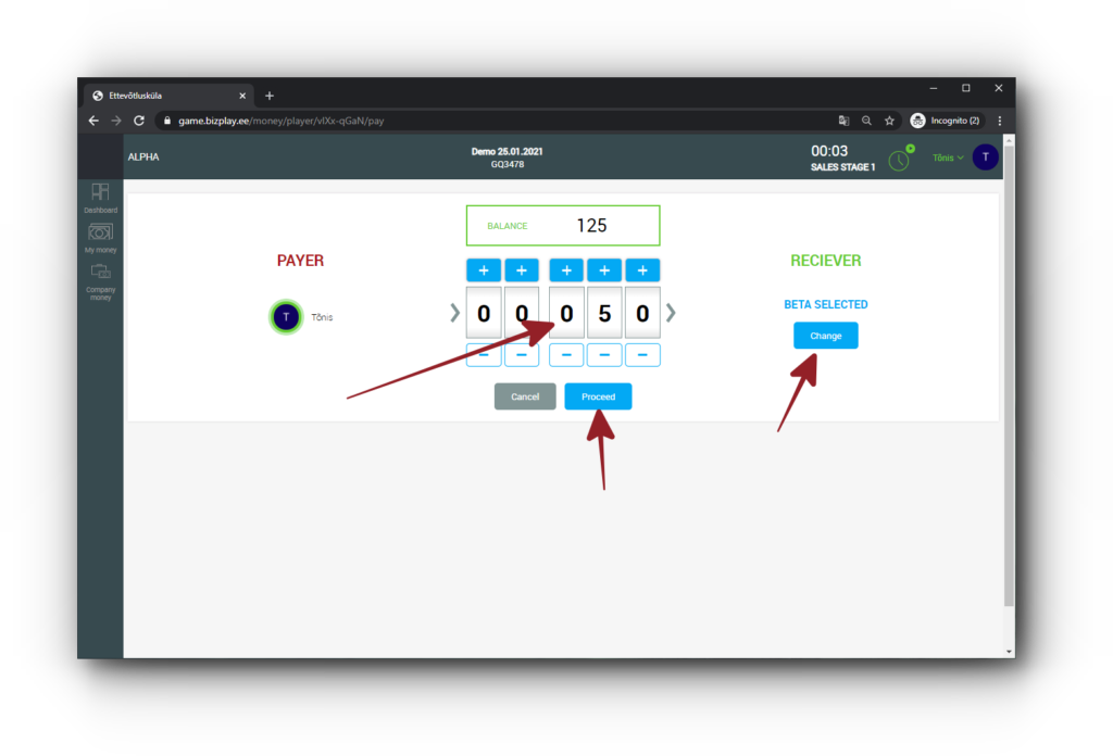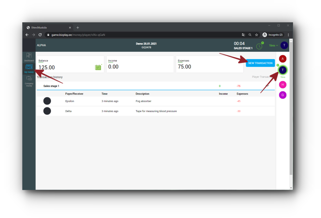 1. Select ‘My money’ from the menu on the left. Check on the right that the correct role is active. Then press ‘New transaction’. Only individuals have to make transfers in the game.