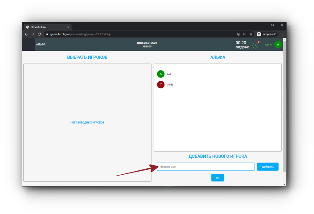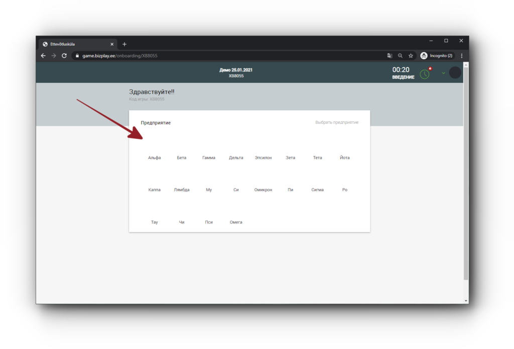 1. Зайдите на игровую платформу по адресу game.bizplay.ee и введите код игры.
