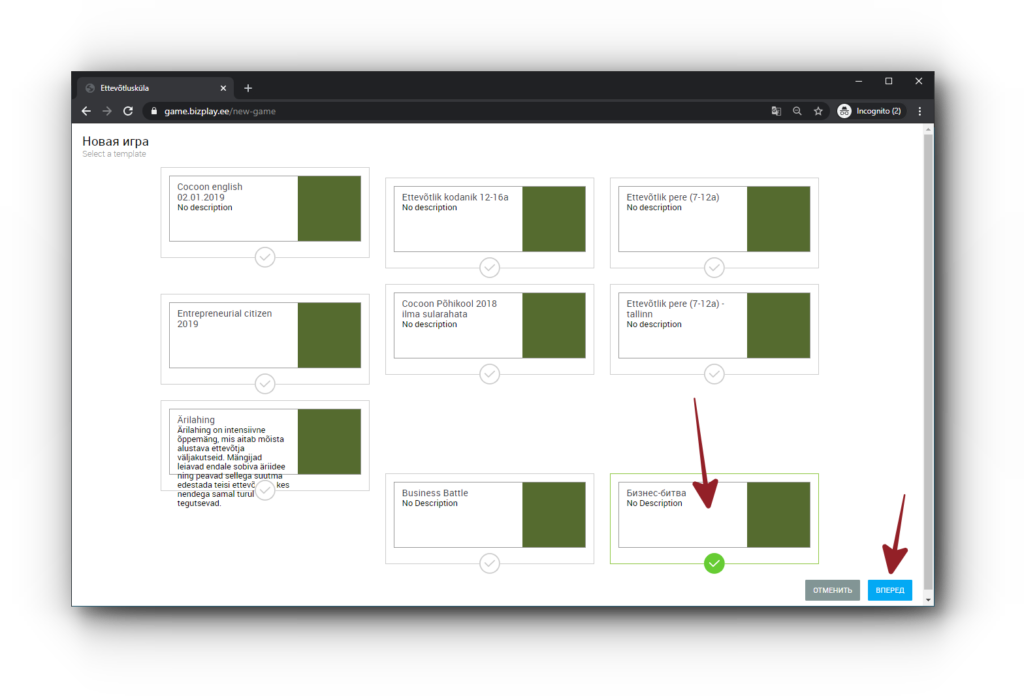 2. Вы увидите доступные модели игр. Для создания игры «Бизнес-битва» выберите модель игры «Бизнес-битва» и нажмите на надпись «Вперед».