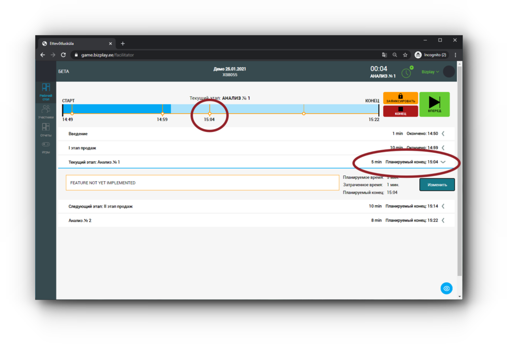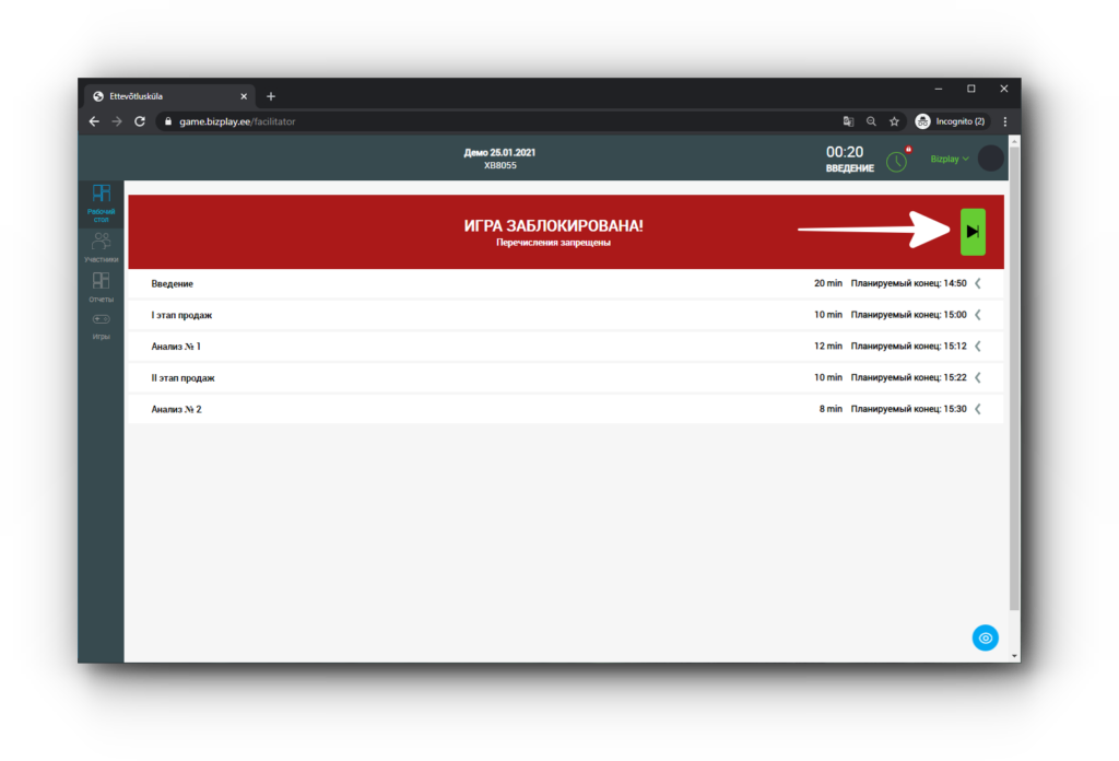 Для управления этапами игры у руководителя есть отдельный инструмент, с помощью которого можно: