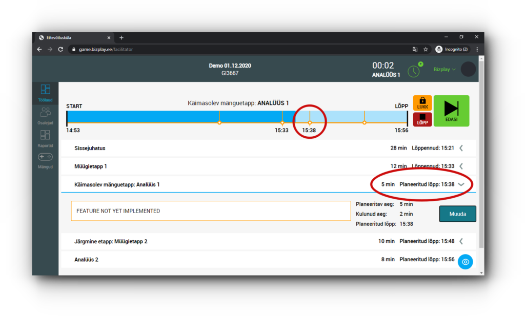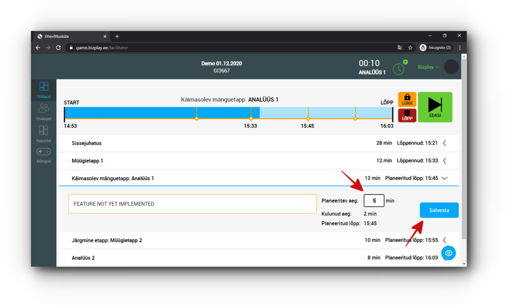 3. Mänguetappide aega saab juhendaja muuta vastavalt vajadusele. Vaikeseaded annavad juba soovitatud etappide pikkused ette, kuid neid on võimalik muuta nii enne mängu kui ka mängu jooksul.