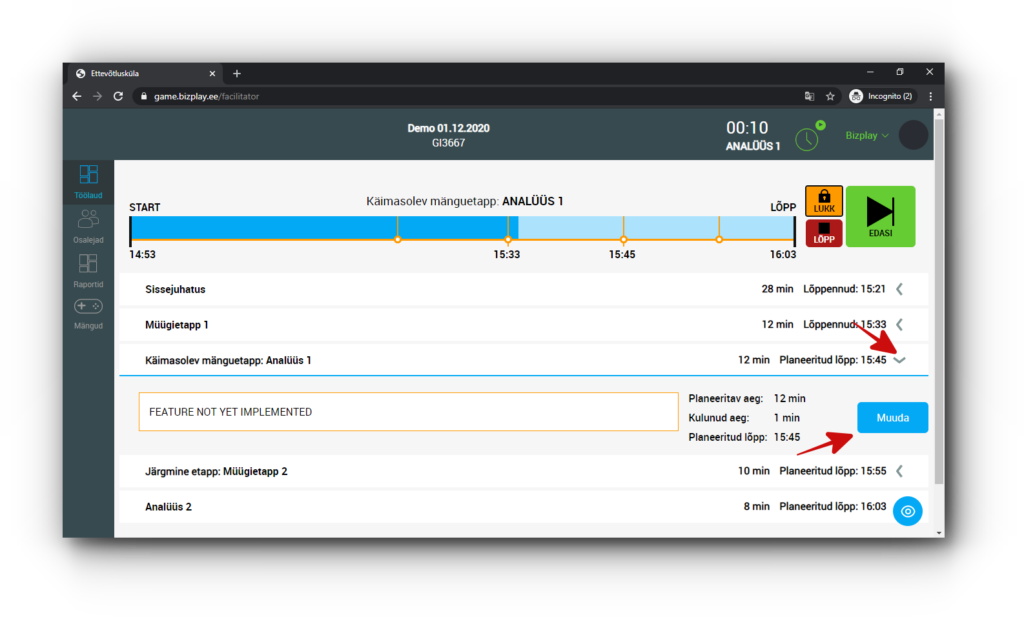 Mänguetappide juhtimiseks on juhendajal eraldi tööriist, millega: