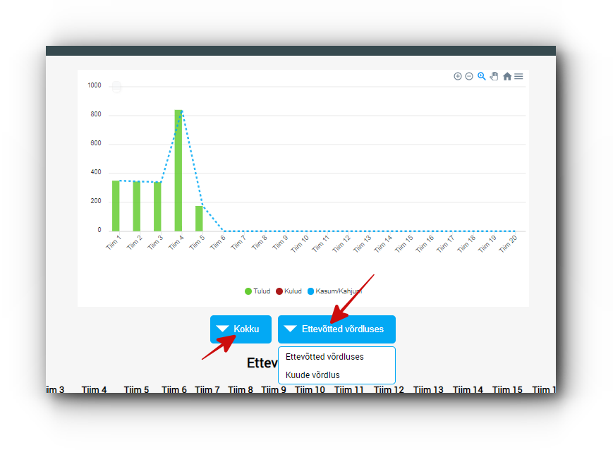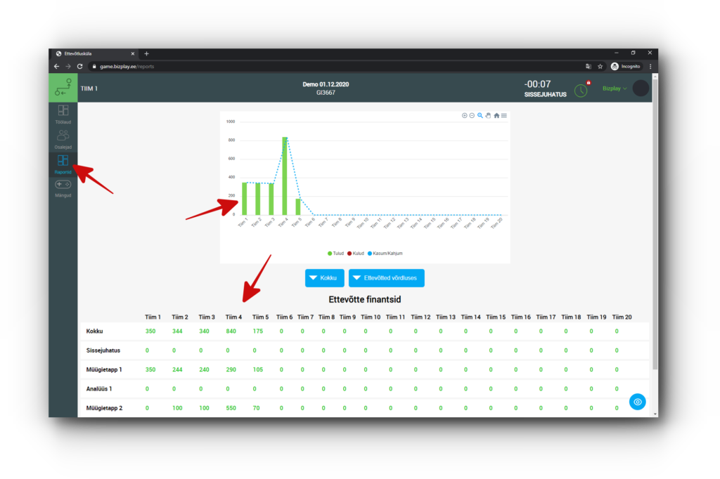 1. Raportite vaatamiseks tuleb valida vasakult menüüst “Raportid”. Mängudes saab vaadata ettevõtete seisu graafiliselt ja tabeli kujul.