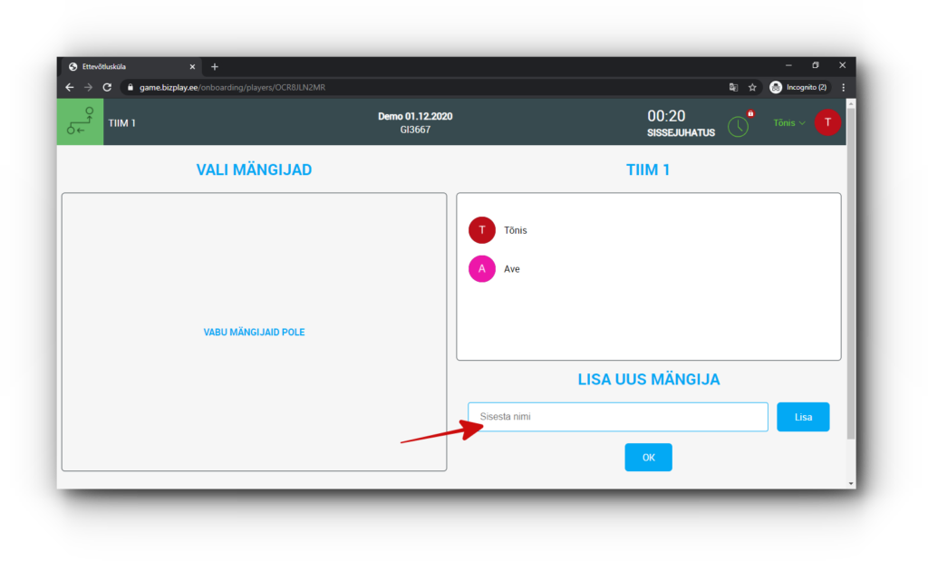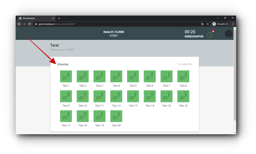 1. Avage mänguplatvorm game.bizplay.ee ja sisestage mängukood